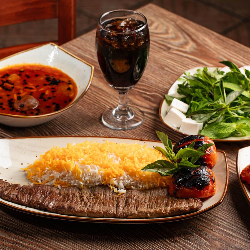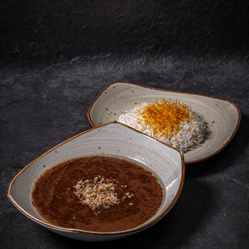A classic Persian stew made with a blend of fresh herbs, dried limes, red beans, and slow-cooked beef. Served with rice flavored with saffron.