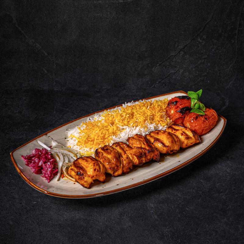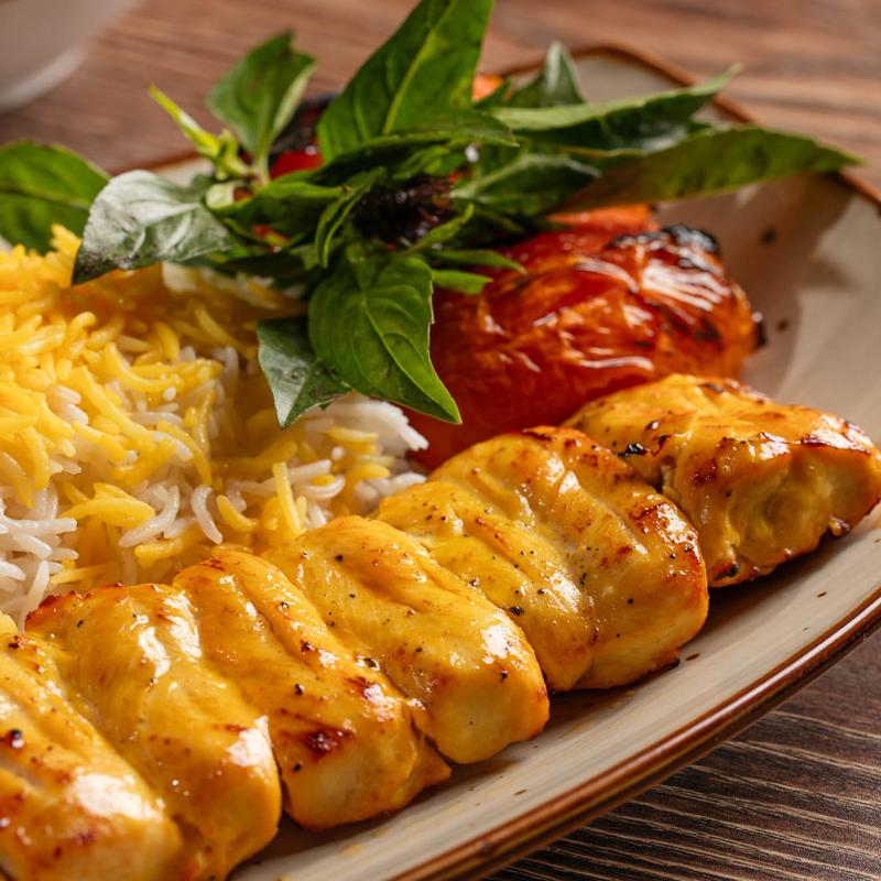 Skewered Filet Mignon, marinated and grilled over charcoal with tomato, bell pepper, and onion. Comes with a grilled tomato and saffron-spiced basmati rice.
