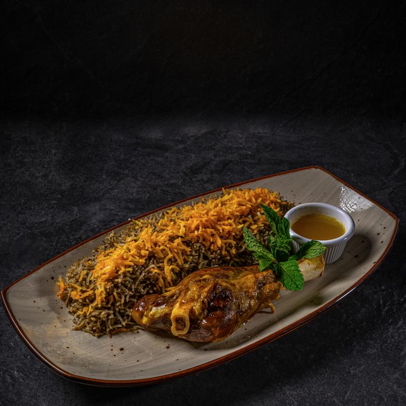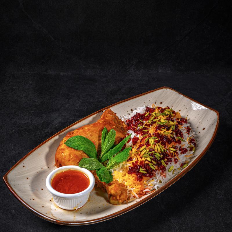 A traditional blend of juicy chicken thigh and aromatic basmati rice topped with barberries and saffron, offering a perfect balance of sweet and tart flavors.