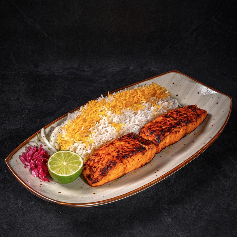 A skewer of marinated salmon filet, charbroiled to perfection. Accompanied by aromatic basmati rice flavored with saffron.