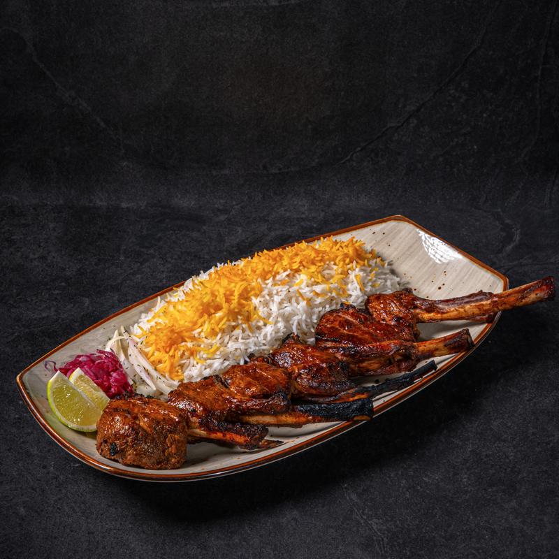 Two skewers of seasoned ground beef, grilled to a smokey flavor. Comes with a grilled tomato and saffron-infused basmati rice.